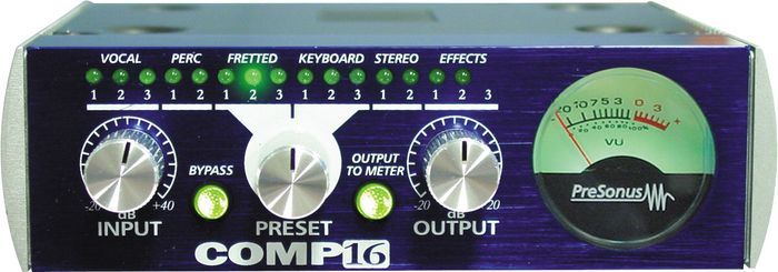 Небольшой и простой в обращении компрессор Presonus COMP16 имеет 16 предварительно установленных программ, содержащих стандартные динамические настройки для вокала, перкуссии, гитар и клавишных инструментов, для обработки стерео материала, а также компрессионные эффекты. Для использования прибора достаточно выбрать нужную программу и отрегулировать уровни входного и выходного сигналов. Большой стрелочный индикатор, расположенный на передней панели, позволяет отслеживать как уровни сигналов, так и величину компрессии. Входы и выходы выполнены на сбалансированых разъёмах XLR и несбалансированых разъемах 1/4" TRS.